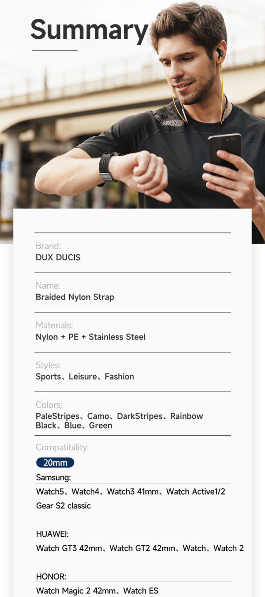 De Dux Ducis Mixture II Strap is gemaakt van hoogwaardig nylon geweven stof dat ademend, zacht en elastisch is. Het bandje is comfortabel te dragen en heeft een prachtig uiterlijk met roestvrijstalen gesp die zorgt voor een nauwsluitende pasvorm om de pols. Het bandje is van hoge kwaliteit, huidvriendelijk en tovert je horloge met een breedte aansluiting van 20MM om in een stijlvol item. Doordat het bandje zweet- en waterbestendig is, is het ook ideaal voor het sporten! De Mixture II is eenvoudig te installeren en verwijderen, waardoor je ook gemakkelijk kunt rouleren tussen je verschillende bandjes.