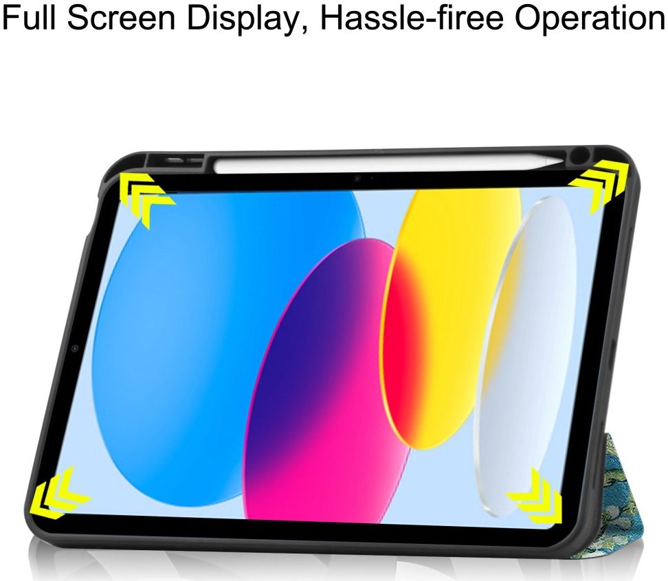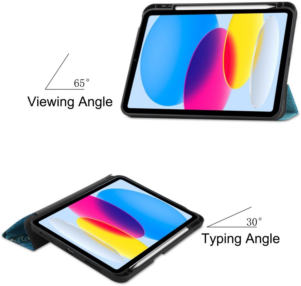 Deze Tri-Fold Hoes is vervaardigd uit hoogwaardig kunstleer en hard plastic en biedt optimale bescherming tegen krassen, stof, stoten, vuil en andere dagelijkse beschadigingen. Het Tri-Fold Hoesje beschermt je Apple iPad 11 (2025) / 10.9 (2022) display en achterzijde met sterk hard plastic frame, waar jij je tablet gemakkelijk in kunt klikken. Het Tri-Fold Hoesje is niet alleen een bescherming, het kan ook als handige stand dienen. Door het Tri-Fold design kun je het hoesje in elke gewenste positie zetten, waardoor je altijd comfortabel video's kunt kijken, teksten kunt lezen of Skypen. Het Tri-Fold Hoesje is daarnaast speciaal voor je Apple iPad 11 (2025) / 10.9 (2022) ontworpen. Het hoesje heeft een leuke print, waardoor jij je tablet een persoonlijk tintje kunt geven.