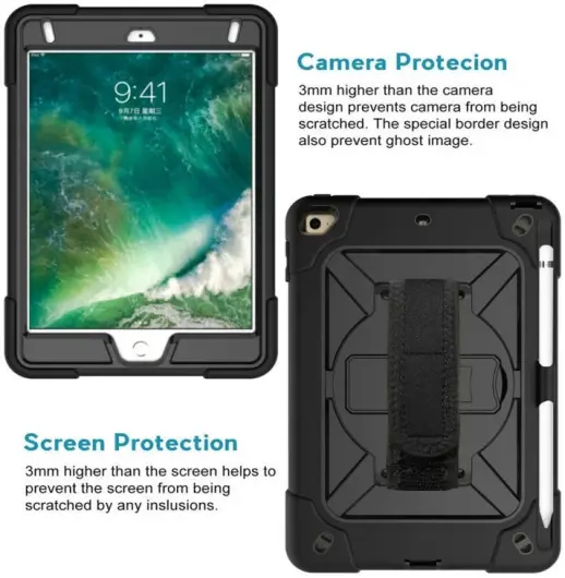 Wanneer je iPad Mini 4/5 valt, hoef je niet bang te zijn dat deze gelijk kapot is. De hoes biedt een drielaagse 360 graden bescherming. De bovenste laag is de siliconen rand die de eerste klappen opvangt en verwerkt. Hieronder zit een laag hard plastic die de complete achter- en zijkant bedekt en verdere klappen maximaal absorbeert. Aan het plastic zit de handriem bevestigd, die je dus in de gewenste positie kunt afstellen. De derde laag is de ingebouwde screen protector. Deze bedekt de display van je tablet en voorkomt schade van bijvoorbeeld barsten en krassen. Op deze manier is jouw Apple iPad Mini 4/5 volledig beschermd.