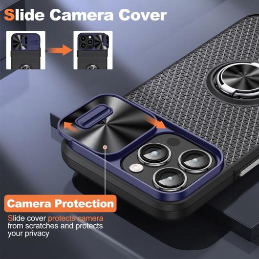 Apple iPhone 14 Pro Hoesje Camera Slider en Kickstand Ring Blauw Zwart