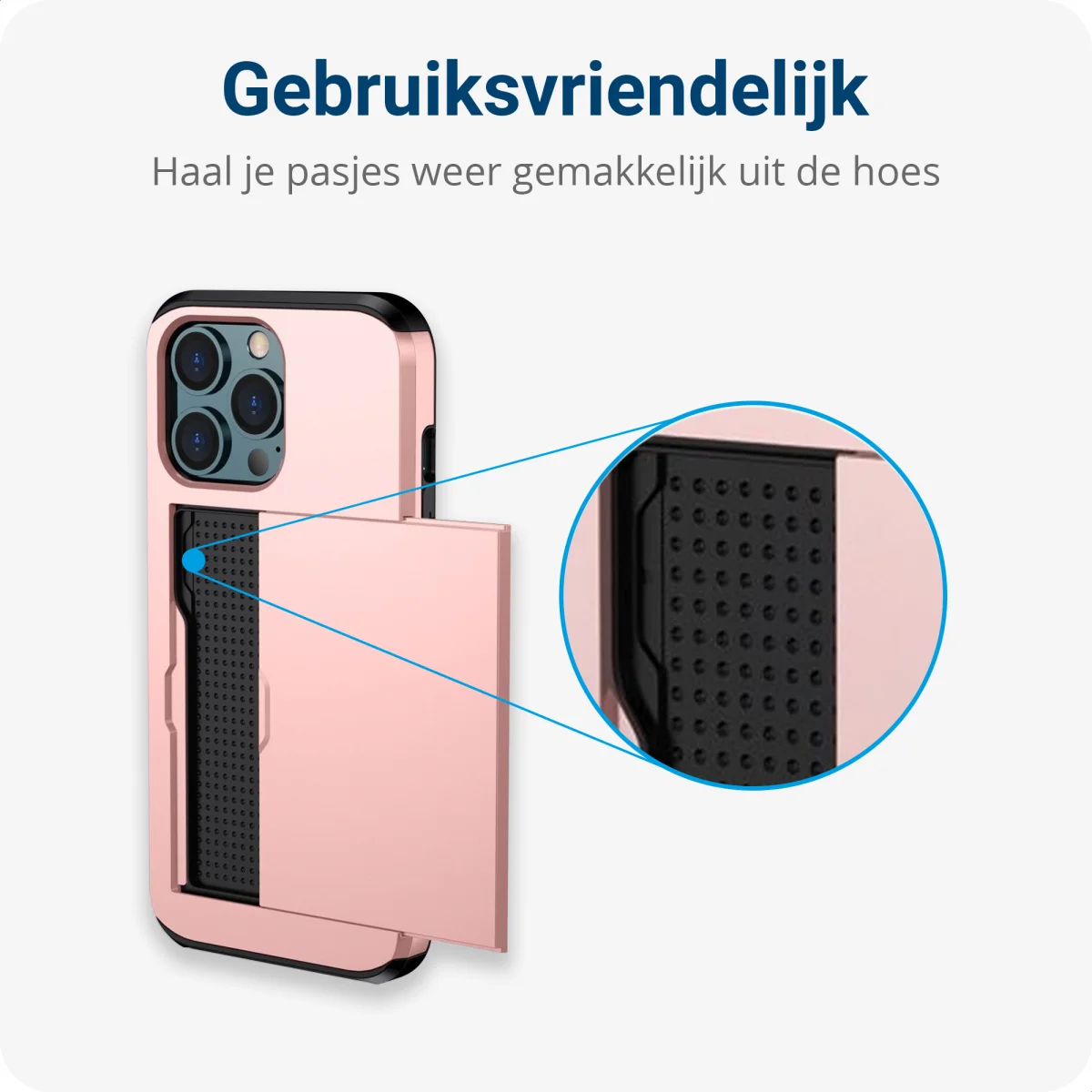 Dit Apple iPhone 14 Pro hoesje beschikt over een handige, schuifbare kaarthouder. Hierin kun jij je twee belangrijkste pasjes, zoals je bankpas of ID-kaart in opbergen. Je portemonnee kun je met dit hoesje gerust thuis laten. De back cover biedt een dubbellaagse bescherming van hard plastic en TPU tegen vallen en stoten. De verhoogde randen bij de camera en het scherm zorgen ervoor dat deze het oppervlak niet raken wanneer jij je Apple iPhone 14 Pro neerlegt op een tafel of bureau.