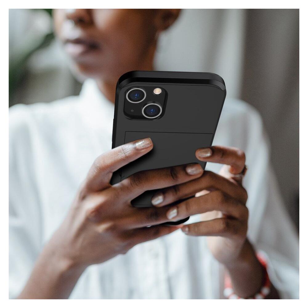 Dit Apple iPhone 15 hoesje beschikt over een handige, schuifbare kaarthouder. Hierin kun jij je twee belangrijkste pasjes, zoals je bankpas of ID-kaart in opbergen. Je portemonnee kun je met dit iPhone 15 hoesje gerust thuis laten. De back cover biedt een dubbellaagse bescherming van hard plastic en TPU tegen vallen en stoten. De verhoogde randen bij de camera en het scherm zorgen ervoor dat deze het oppervlak niet raken wanneer jij je Apple iPhone 15 vlak neerlegt op een tafel of bureau.