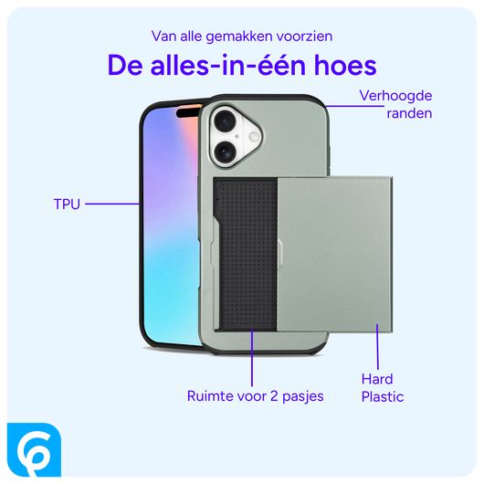 Dit Apple iPhone 16 hoesje beschikt over een handige, schuifbare kaarthouder. Hierin kun jij je twee belangrijkste pasjes, zoals je bankpas of ID-kaart in opbergen. Je portemonnee kun je met dit iPhone 16 hoesje gerust thuis laten. De back cover biedt een dubbellaagse bescherming van hard plastic en TPU tegen vallen en stoten. De verhoogde randen bij de camera en het scherm zorgen ervoor dat deze het oppervlak niet raken wanneer jij je Apple iPhone 16 vlak neerlegt op een tafel of bureau.