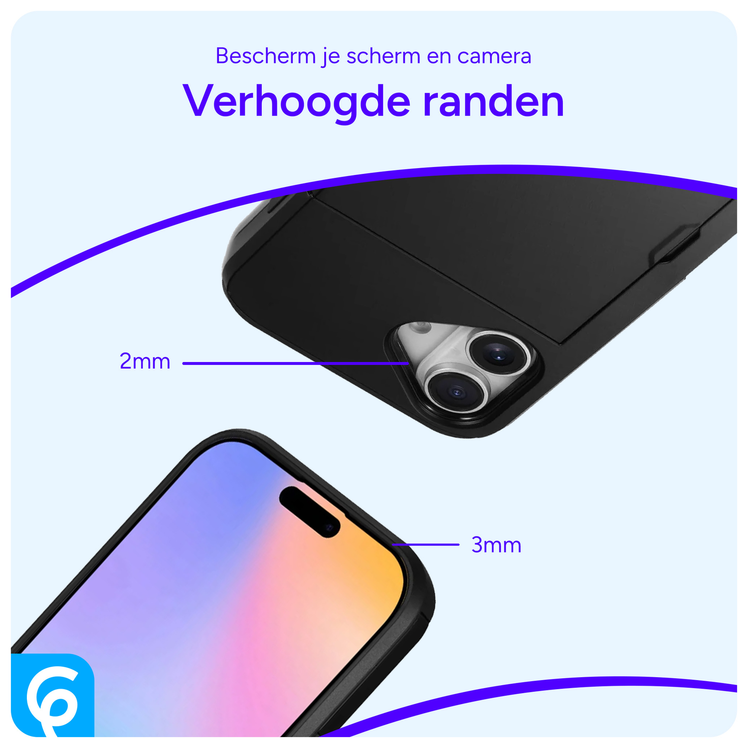 - Verhoogde randen rond de camera uitsparing en de display voor extra bescherming