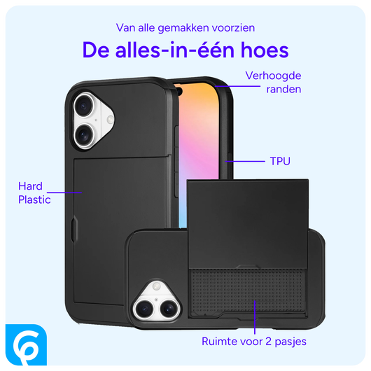 Dit Apple iPhone 16 hoesje beschikt over een handige, schuifbare kaarthouder. Hierin kun jij je twee belangrijkste pasjes, zoals je bankpas of ID-kaart in opbergen. Je portemonnee kun je met dit iPhone 16 hoesje gerust thuis laten. De back cover biedt een dubbellaagse bescherming van hard plastic en TPU tegen vallen en stoten. De verhoogde randen bij de camera en het scherm zorgen ervoor dat deze het oppervlak niet raken wanneer jij je Apple iPhone 16 vlak neerlegt op een tafel of bureau.