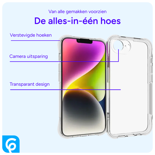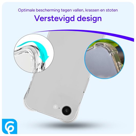 Dit transparante hoesje is een dunne back cover die op maat is gemaakt voor de Apple iPhone 16e. Het hoesje is vervaardigd uit schokbestendig en dun TPU materiaal dat een goede val- en stootbescherming biedt door de verstevigingen op de hoeken. Het mooie design van jouw Apple iPhone 16e blijft behouden doordat deze back cover volledig transparant is!