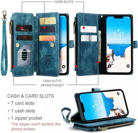 Het CaseMe C30 Apple iPhone 15 hoesje heeft genoeg kaartsleuven met een geldvak aan de binnenzijde en een ritsvak aan de buitenkant zodat jij al je pasjes en brief- en muntgeld gemakkelijk meeneemt. Door de stevige magnetische sluiting blijft het hoesje stevig gesloten en vallen er geen eigendommen uit. Het hoesje beschermt de voor- en achterkant van je telefoon voor een volledige bescherming tegen schade. Ook kun je comfortabel video's of series bekijken doordat de hoes om is te vouwen tot standaard.