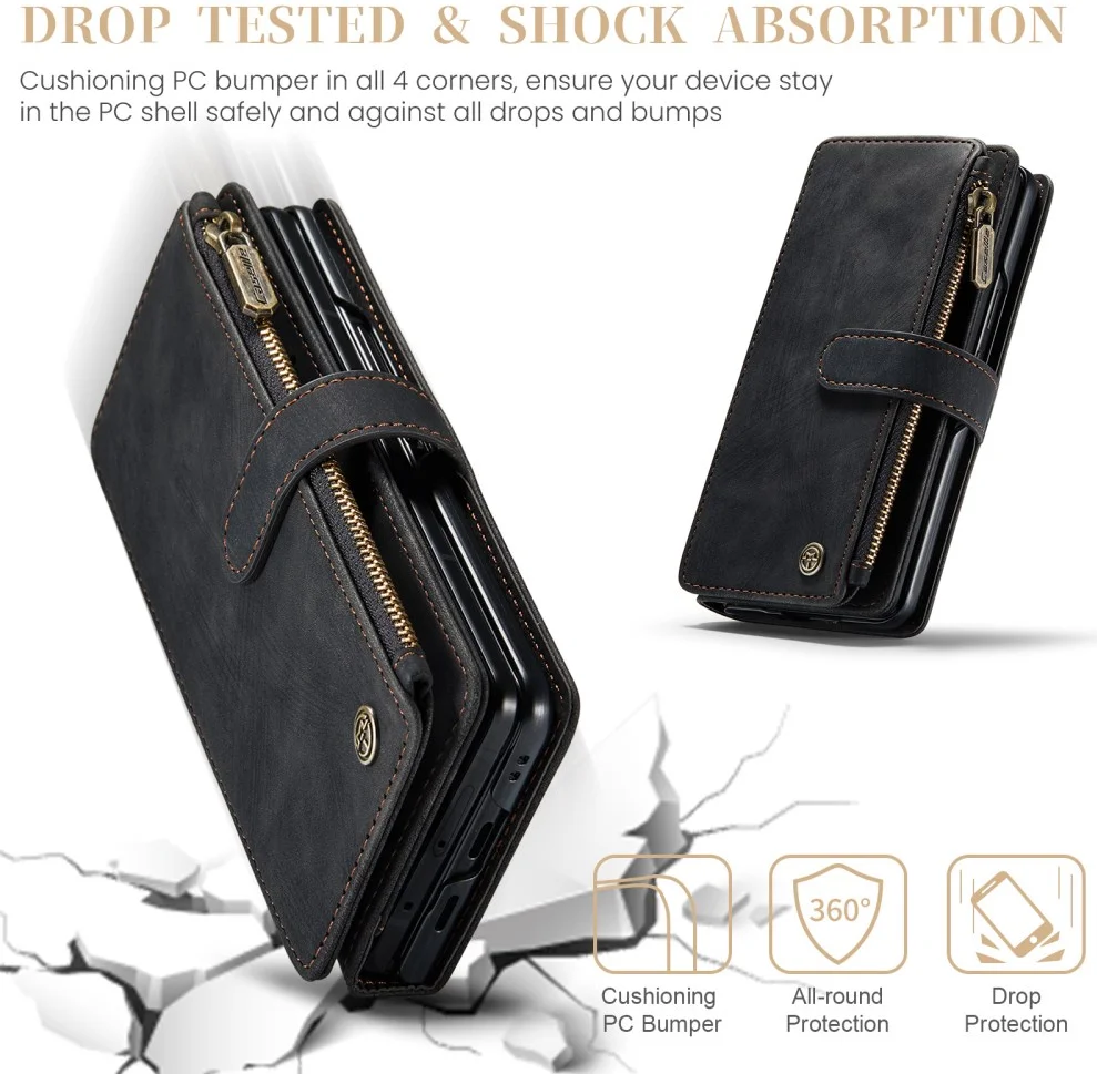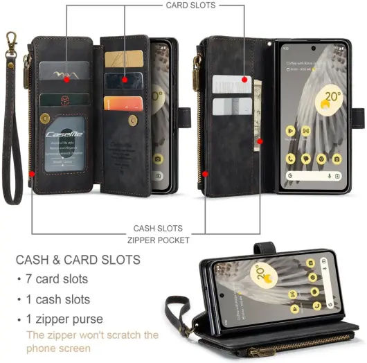 Het CaseMe C30 Google Pixel Fold hoesje heeft genoeg kaartsleuven met een geldvak aan de binnenzijde en een ritsvak aan de buitenkant zodat jij al je pasjes en brief- en muntgeld gemakkelijk meeneemt. Door de stevige magnetische sluiting blijft het hoesje stevig gesloten en vallen er geen eigendommen uit. Het hoesje beschermt de voor- en achterkant van je telefoon voor een volledige bescherming tegen schade. Ook kun je comfortabel video's of series bekijken doordat de hoes om is te vouwen tot standaard.