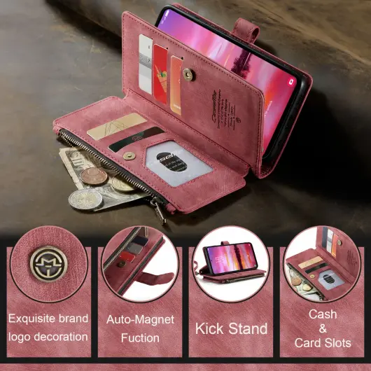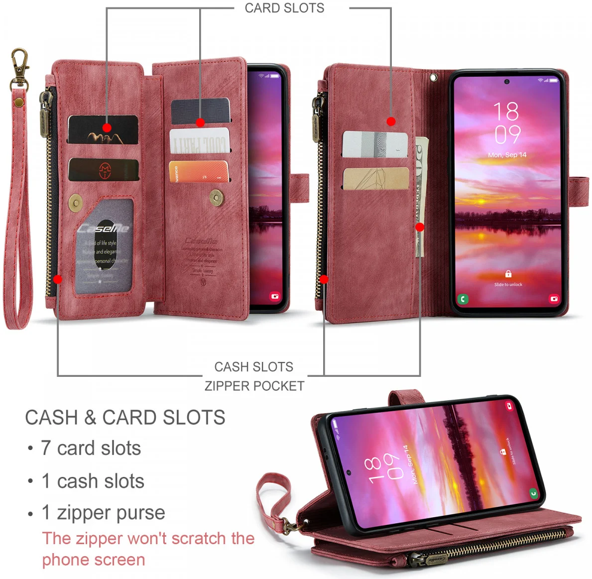 Het CaseMe C30 Samsung Galaxy S24 hoesje heeft genoeg kaartsleuven met een geldvak aan de binnenzijde en een ritsvak aan de buitenkant zodat jij al je pasjes en brief- en muntgeld gemakkelijk meeneemt. Door de stevige magnetische sluiting blijft het hoesje stevig gesloten en vallen er geen eigendommen uit. Het hoesje beschermt de voor- en achterkant van je telefoon voor een volledige bescherming tegen schade. Ook kun je comfortabel video's of series bekijken doordat de hoes om is te vouwen tot standaard.