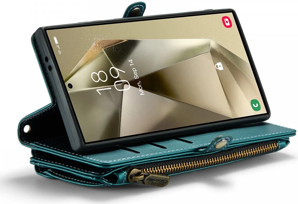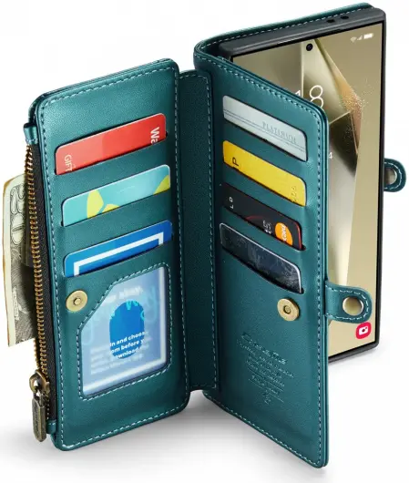 Het CaseMe C36 Samsung Galaxy S24 Ultra hoesje heeft genoeg kaartsleuven aan de binnenkant met een ritsvak en een extra compartiment aan de buitenkant zodat jij al je pasjes, brief- en muntgeld of andere kleine spullen gemakkelijk meeneemt. Door de stevige drukknoop sluiting blijft het hoesje stevig gesloten en vallen er geen eigendommen uit. Het hoesje beschermt de voor- en achterkant van je telefoon voor een volledige bescherming tegen schade. Ook kun je comfortabel video's of series bekijken doordat de hoes om is te vouwen tot standaard. Het hoesje wordt geleverd met een stijlvolle schouder strap, waardoor jij je telefoon gemakkelijk meeneemt.