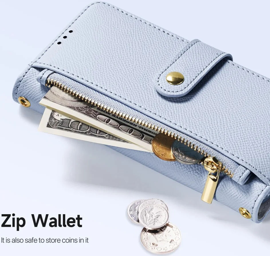 - Ruimte voor zes pasjes en extra opbergvak met rits.