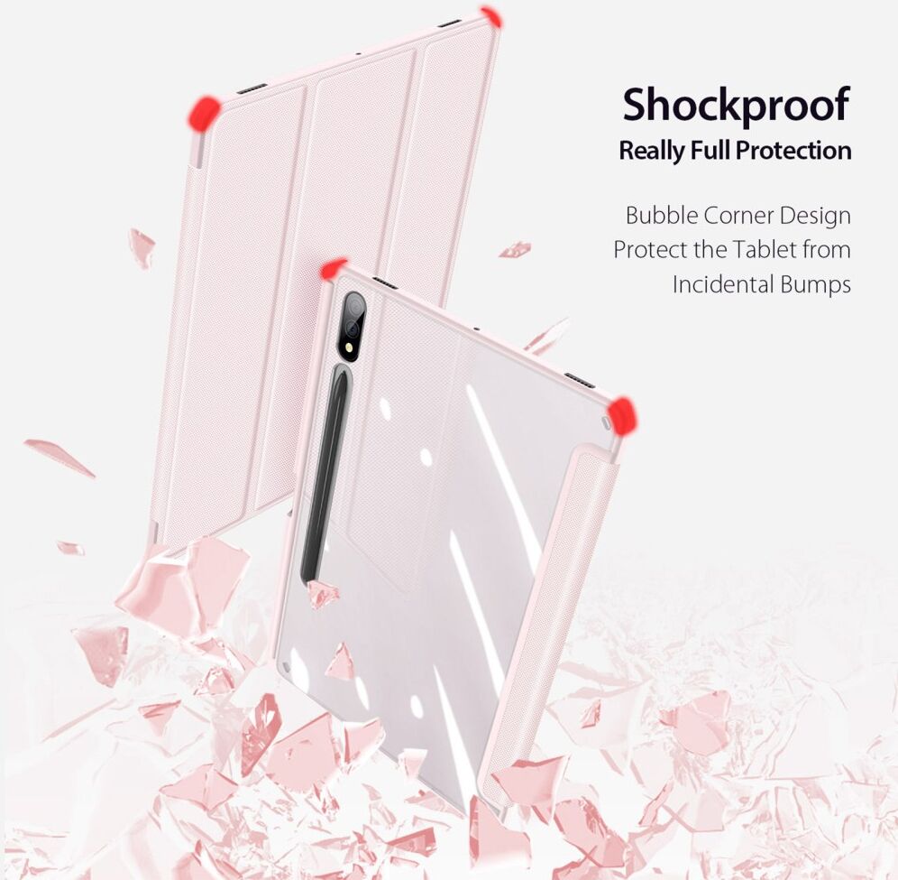 Bescherm je Samsung Galaxy Tab S9 Plus / S9 FE Plus met deze Dux Ducis book case. De hoes is vervaardigd uit een grotendeels transparante hard plastic back cover met TPU randen dat wordt omhuld door een kunstlederen flip. Uitgerust met een 'Bubble Corner' ontwerp is de hoes schokbestendig ontworpen, waardoor je niet bang hoeft te zijn voor een val of stootje. De hoes is uitgerust met een tri-fold standaard en heeft een energiebesparende sleep/wake functie. Doordat de case gedeeltelijk transparant is, wordt het originele design van je Samsung Galaxy Tab S9 Plus / S9 FE Plus niet verborgen!