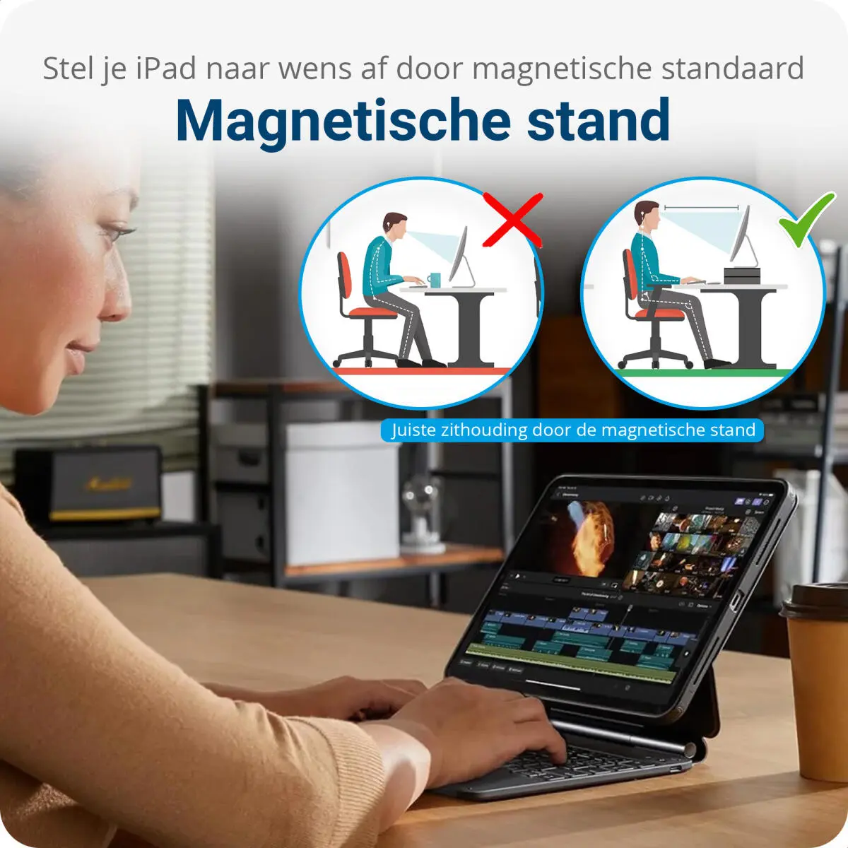 - Je stelt je iPad naar wens af door de magnetische bevestiging en de standaard