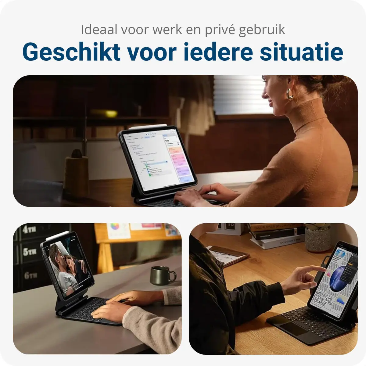 De ESR Rebound Magnetic Keyboard Case 360 verandert je iPad Pro 11 (2024/2025) in een laptop. Met het ultra-gevoelige trackpad navigeer je gemakkelijk en snel op je iPad zonder dat je elke keer het scherm hoeft aan te raken. De toetsen voelen prettig aan zodat jij comfortabel aan de slag gaat op je iPad. Je bevestigt je iPad in de back cover die door ingebouwde magneten ook uitneembaar is. Hierdoor kun jij je iPad apart als back cover gebruiken wanneer jij het toetsenbord niet nodig hebt. Door de magneet bevestig jij de back cover zowel horizontaal als verticaal in de hoes. Samen met de standaard kun je hierdoor je iPad naar wens afstellen zodat je comfortabel aan de slag gaat.