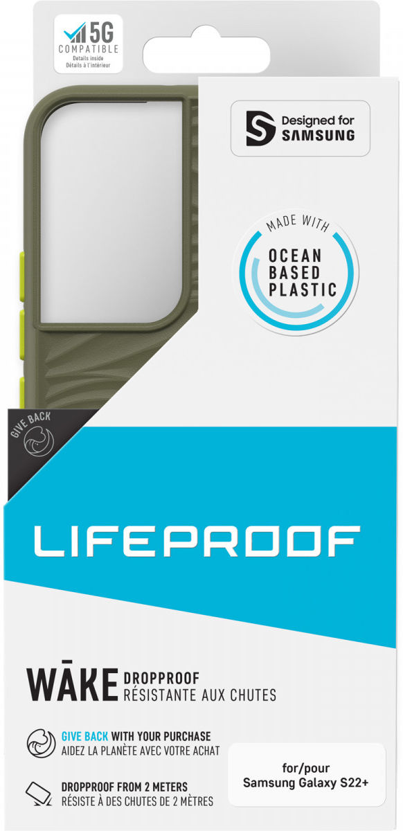 De LifeProof Wake is een duurzaam hoesje dat voor 85% bestaat uit gerecycled plastic uit de oceaan, zoals oude visnetten. Dankzij valbescherming tot 2 meter hoogte is je Samsung Galaxy S22 Plus beschermd tegen vallen tot deze hoogte. Door de verstevigde randen met verhogingen is het display beschermd tegen krassen en slijtage wanneer je jouw telefoon vlak neerlegt.