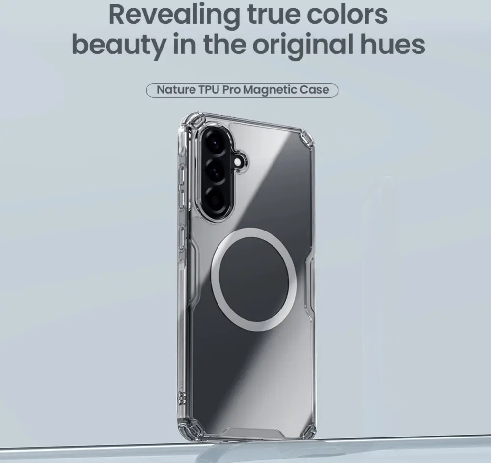 De Nillkin Nature is gemaakt van een transparante hard plastic achterkant met verstevigde TPU randen. Door deze verstevigde TPU randen krijgt de achter- en zijkant van je Samsung Galaxy A56 goede bescherming tegen vallen, stoten en krassen. Het hoesje voegt nauwelijks volume toe aan je telefoon en maakt deze niet veel dikker. Doordat het hoesje transparant is, blijf je het mooie design van de Samsung Galaxy A56 zien. Door een ingebouwde magneet is het hoesje compatibel met Magsafe en Qi2-accessoires.