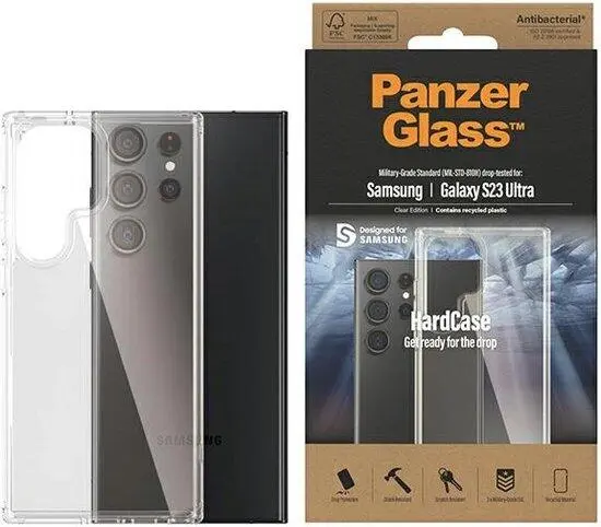 De PanzerGlass Hard Case is getest volgens 3x de militaire standaard voor optimale bescherming tegen vallen tot 3.6 meter hoogte. Gemaakt van niet-vergelend TPU blijft dit hoesje altijd mooi transparant zodat jij je Samsung Galaxy S23 Ultra blijft zien. Een antibacteriële coating weert veelvoorkomende bacteriën en vingerafdrukken zodat je een écht schoon hoesje hebt. Het frame van de HardCase is gemaakt van 100% gerecycled materiaal waardoor het hoesje beter is voor het milieu dan een standaard hoesje. Daarnaast wordt deze geleverd in een FSC™-gecertificeerde verpakking die gerecycled kan worden.