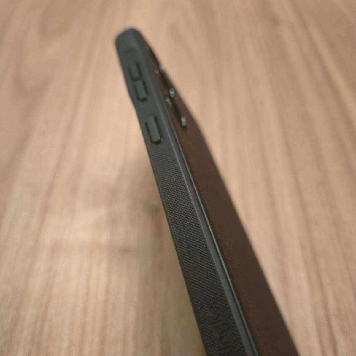 Goede pasvorm, extra verhoging bij camera's, verhoging voor het scherm maar alleen in de hoeken zodat je er in het gebruik geen last van hebt en een lekkere textuur met veel grip.