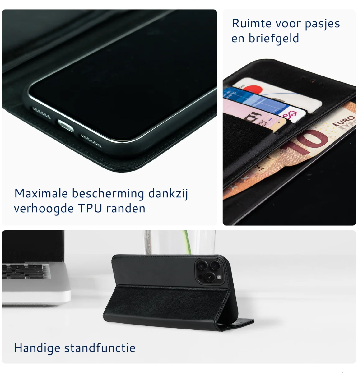 - Bewaar 3 pasjes en brief- en muntgeld in de voorflap van het hoesje.