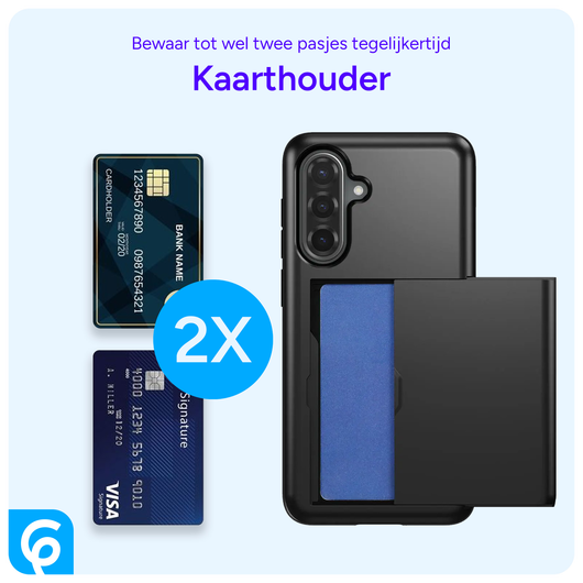 Dit Samsung Galaxy A56 / A36 hoesje beschikt over een handige, schuifbare kaarthouder. Hierin kun jij je twee belangrijkste pasjes, zoals je bankpas of ID-kaart in opbergen. Je portemonnee kun je met dit Galaxy A56 / A36 hoesje gerust thuis laten. De back cover biedt een dubbellaagse bescherming van hard plastic en TPU tegen vallen en stoten. De verhoogde randen bij de camera en het scherm zorgen ervoor dat deze het oppervlak niet raken wanneer jij je Samsung Galaxy A56 / A36 vlak neerlegt op een tafel of bureau.