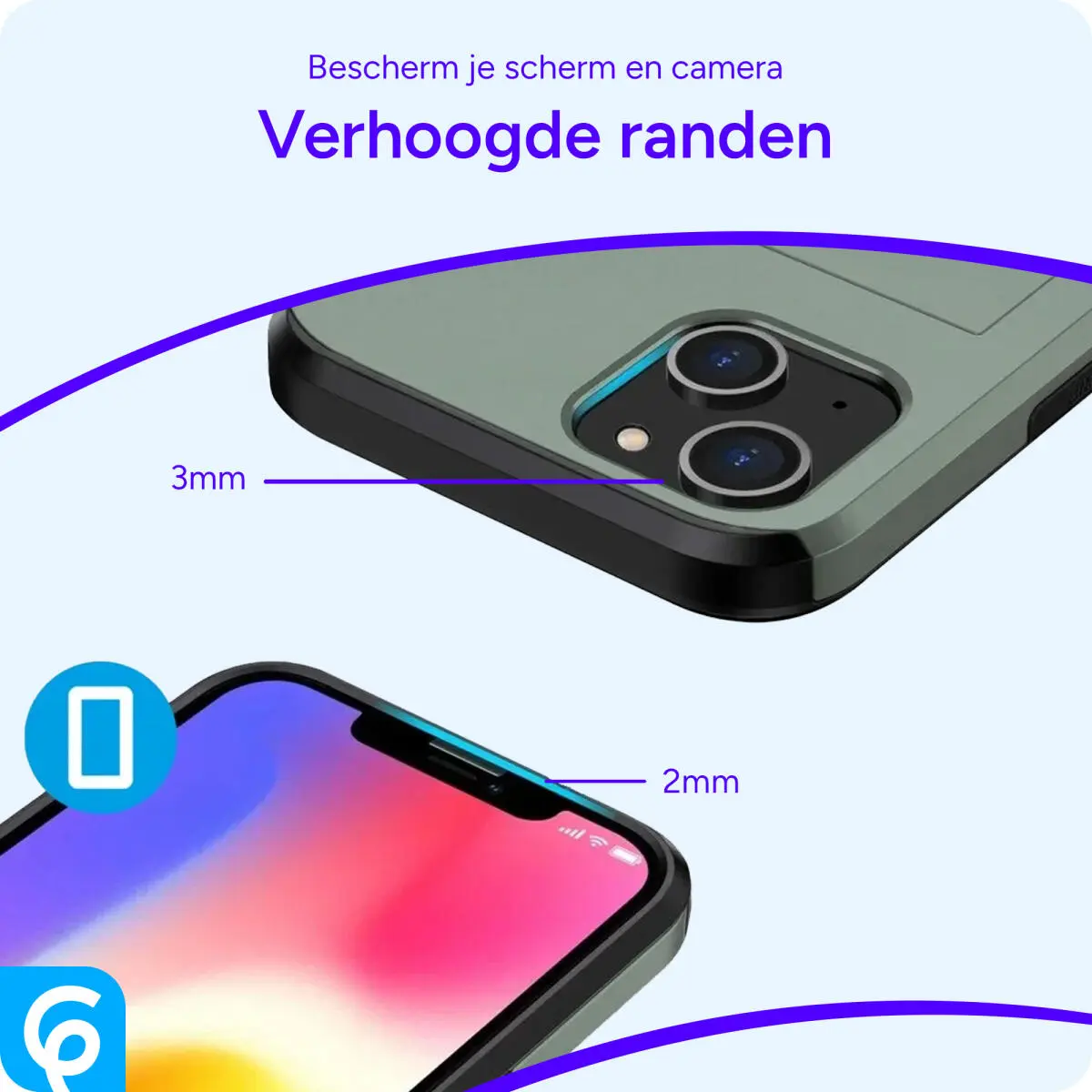 - Verhoogde randen rond de camera uitsparing en de display voor extra bescherming