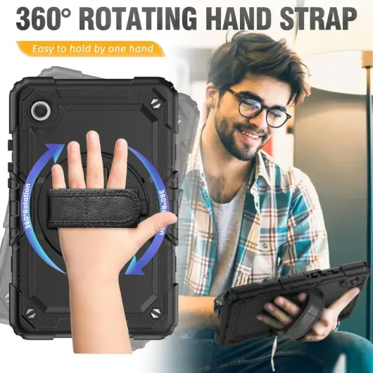 Deze hoes is ideaal voor beroepen waarin je veel in beweging bent. Denk hierbij aan beroepen in de bouw, logistieke sector of de horeca. De handriem is ideaal wanneer je orders aan het picken bent, bestellingen in de horeca opneemt of wanneer je een bouwtekening aan het bekijken bent. Daarnaast beschikt de hoes over een uitklapbare, 360 graden draaibare kickstand. Hiermee kun jij je tablet in de gewenste kijkhoek plaatsen in zowel horizontale als verticale positie. Met de meegeleverde schouderband kun jij je Samsung Galaxy Tab A9 gemakkelijk om je lichaam bevestigen en comfortabel meenemen.