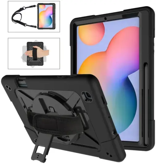 Samsung Galaxy Tab S6 Lite Hoes Back Cover met Kickstand en Handriem Zwart