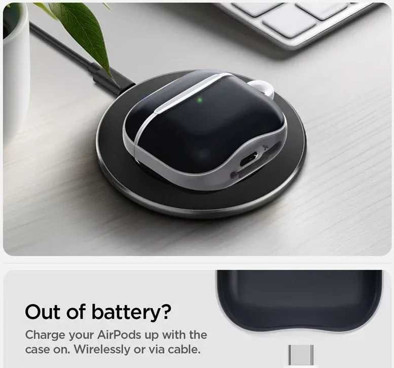 De Spigen Classic C1 heeft een premium retro design waardoor je AirPods een zeer stijlvol uiterlijk krijgen. Gemaakt van hoogwaardig TPU en polycarbonaat bidt het een uitstekende bescherming tegen schade. Op deze manier blijven je AirPods veilig afgesloten. Het hoesje heeft op maat gemaakte uitsparingen en is geschikt voor draadloos opladen. Geleverd met een karabijnhaak voor gemakkelijke bevestiging aan je tas of een ander item.