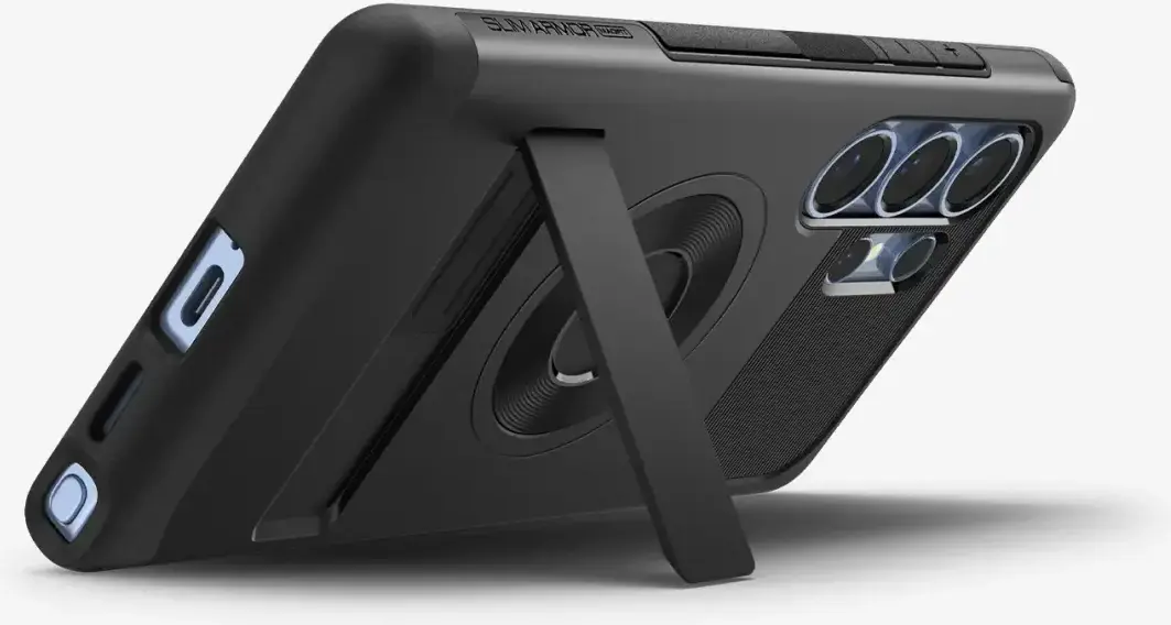 De Slim Armor MagFit combineert extreme verdediging in een slank en zakvriendelijk ontwerp. De dubbellaagse structuur opgebouwd uit TPU en hard plastic is uitgerust met Air Cushion technologie en verhoogde randen bij het scherm en de camera. De hoes is gecertificeerd met de militaire standaard en biedt dus optimale bescherming voor je Samsung Galaxy S25 Ultra. Door een ingebouwde magneet klik je MagSafe en Qi2-accessoires op het hoesje. Met de uitklapbare standaard op de achterkant zet je je telefoon horizontaal of verticaal neer om handsfree een serie te kijken, of om te videobellen.