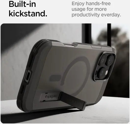 De Spigen Tough Armor is opgebouwd uit drie verschillende verdedigingslagen in een compact frame dat nauwelijks volume of gewicht toevoegt aan je Apple iPhone 16 Pro Max. Uitgerust met Air Cushion technologie, verhoogde randen bij de camera en display en het impact foam aan de binnenzijde bied het hoesje maximale bescherming tegen vallen, stoten en krassen die voldoet aan het militaire standaard. Doordat de hoes MagSafe compatibel is, bevestig je MagSafe accessoires zoals een lader of kaarthouder magnetisch op de achterzijde van je Apple iPhone 16 Pro Max. Met de uitklapbare kickstand op de achterzijde kun je comfortabel videobellen of een film of serie bekijken.