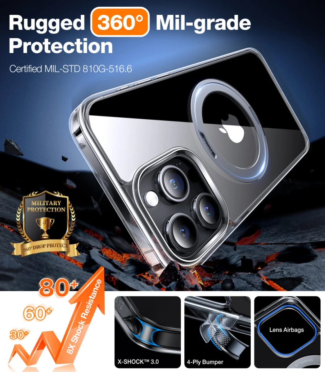 Dankzij 360° luchtkussens en verbeterde X-SHOCK minimaliseert de TORRAS UPro Ostand Pro impact op alle hoeken en is deze bestand tegen minimaal 10.000 vallen tot wel 3 meter hoogte. Samen met de verhoogde cameralip (2,5mm) en -schermrand (1,5 mm) zorgt dit voor een militair gecertificeerde bescherming volgens de MIL-STD-810H-standaard!