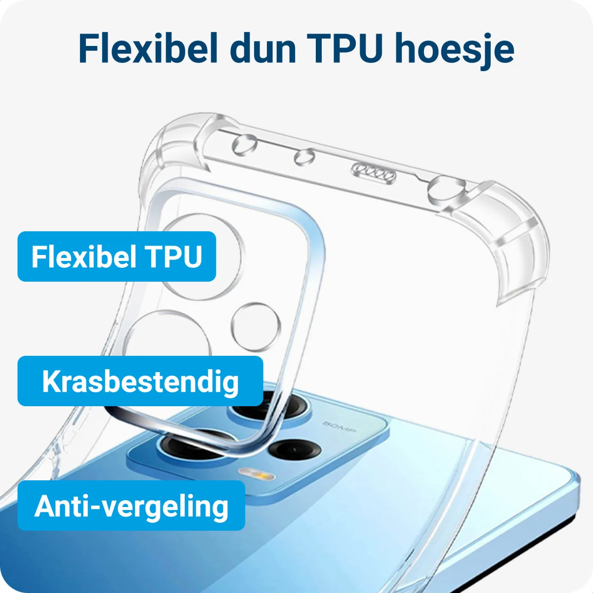 Het transparante hoesje is vervaardigd van het uiterst flexibele TPU materiaal. Ondanks de flexibiliteit zijn dit type hoesjes zeer sterk en zelfs vet- en oliebestendig. Ook is het TPU hoesje zo ontworpen, dat de cover zich om de randen van jouw Xiaomi Poco X5 vouwt. Op deze manier worden vallen door maximaal geabsorbeerd door de verstevigde hoeken van het hoesje.