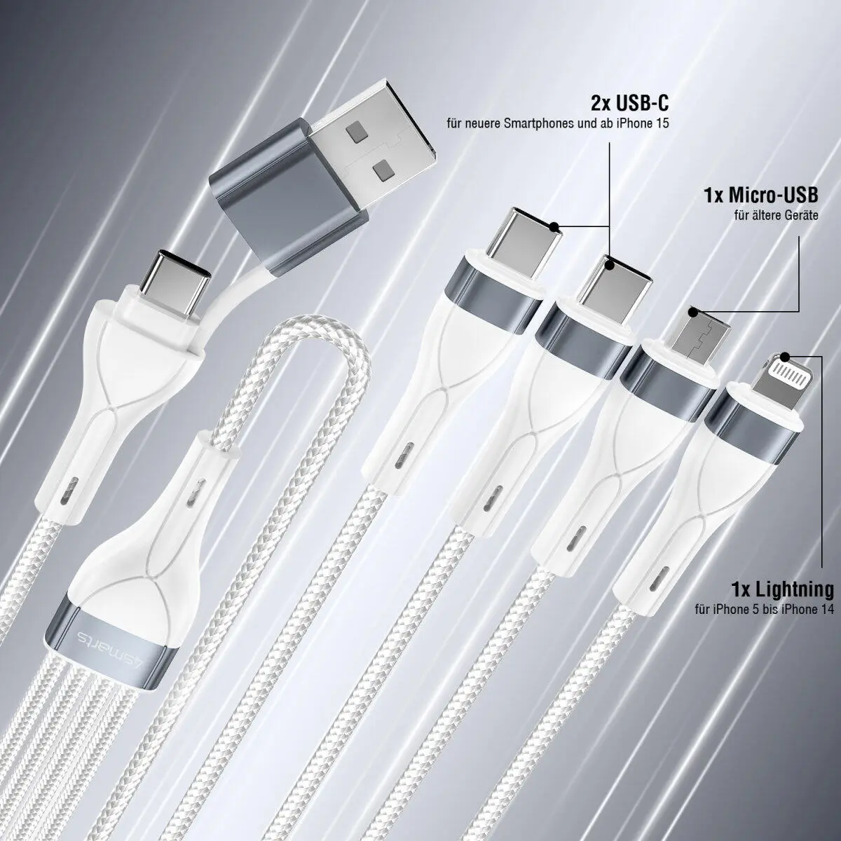 Voordele van de 4smarts 4in2 Multi oplaadkabel 25cm Wit:
