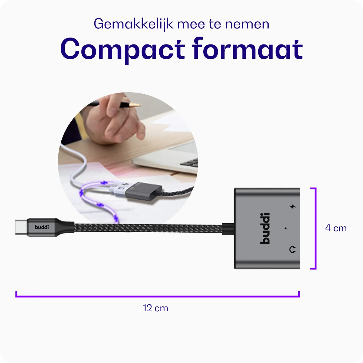 Met de Buddi Ease USB-C Splitter naar audio en opladen hoef je nooit meer te kiezen tussen opladen of muziek luisteren. Deze handige adapter maakt het mogelijk om beide tegelijk te doen, waardoor je altijd verbonden blijft. Dankzij de ingebouwde DAC-chip geniet je van uitstekende geluidskwaliteit, terwijl je apparaat wordt opgeladen. Of je nu onderweg bent, aan het werk bent of gewoon wilt ontspannen met je favoriete muziek, deze splitter biedt een perfecte oplossing. De splitter behoudt bovendien volledige functionaliteit van je headset, inclusief muziekbediening en microfoonfuncties. Hierdoor is hij niet alleen praktisch, maar ook ideaal voor videogesprekken, gaming of het opnemen van spraaknotities.