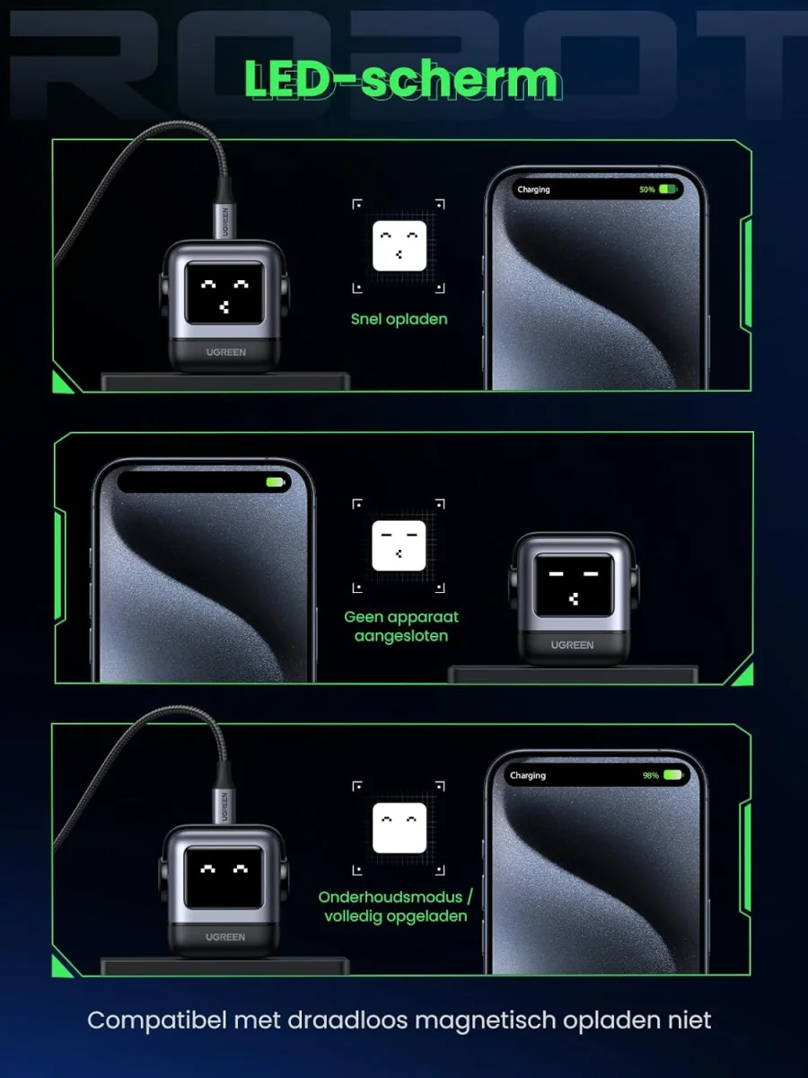 Maak kennis met de UGREEN Nexode RG: jouw ultieme reismaatje met Fast Charge en plezier! Deze schattige Oplader ziet eruit als een ruimterobot en laadt jouw apparaten supersnel op. Met 65W vermogen kun je bijvoorbeeld je MacBook Air M2 binnen 30 minuten voor meer dan de helft opladen! Je kunt tot wel 3 apparaten tegelijkertijd opladen door de 2 USB-C en de USB-A aansluitingen. Het LED-display geeft leuke emoticons weer tijdens het laden en laat je weten wanneer het klaar is. Dankzij de geavanceerde GaN-oplaadtechniek is de Nexode RG extra efficiënt en veilig.