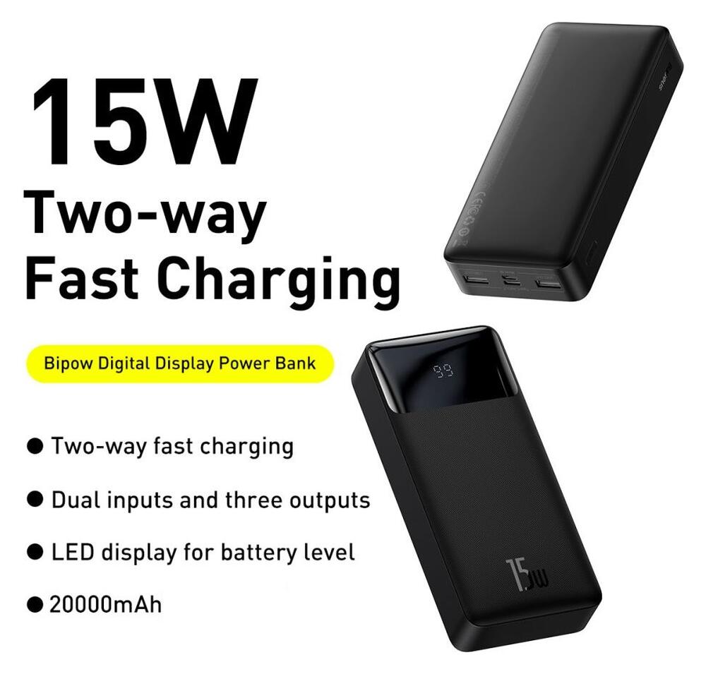 Met de Baseus Bipow laad je de batterij van maximaal 3 apparaten tegelijk op. De powerbank heeft een capaciteit van 20.000 mAh en beschikt over 2 USB en één USB-C poort waarmee jij apparaten zoals je telefoon of oortjes kunt opladen. De powerbank heeft een laadvermogen van maximaal 15W en is gemakkelijk mee te nemen in bijvoorbeeld je tas. Op de digitale display lees je het batterij percentage van de powerbank af. Handig, hierdoor weet je wanneer je de powerbank weer moet opladen via de micro USB poort met de meegeleverde USB naar micro-USB kabel van 25 centimeter of via de USB-C poort.
