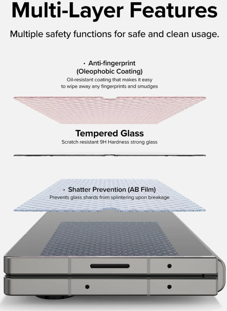 Bescherm de cover display (voorscherm) van je Samsung Galaxy Z Fold 6 met deze tempered glass van Ringke. Deze screen protector heeft een 3-laagse coating met hoge transparantie en aanraakgevoeligheid die de efficiëntie en duurzaamheid verbetert zonder extra bulk toe te voegen. Dankzij het 9H geharde glas biedt het een uitstekende bescherming tegen krassen, vallen en barsten op de cover display van je Samsung Galaxy Z Fold 6. De cover display heeft een anti-vingerafdrukcoating en is case friendly ontworpen waardoor je deze gebruikt in combinatie met een hoesje.
