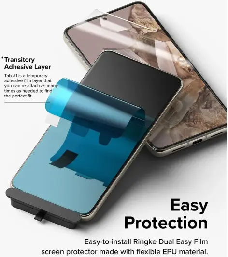 De Ringke Dual Easy Film is een transparante PET display folie met hoge resolutie en aanraakgevoeligheid. Deze Screen Protector heeft een ontwerp uit vier lagen die een goede bescherming biedt tegen vallen en krassen op de display van je Google Pixel 8 Pro. Uitgerust met een stof verwijdering laag worden stofdeeltjes en ander vuil van het scherm geweerd. De screenprotector hecht gemakkelijk en is door de meegeleverde Jig eenvoudig, snel en recht aan te brengen.