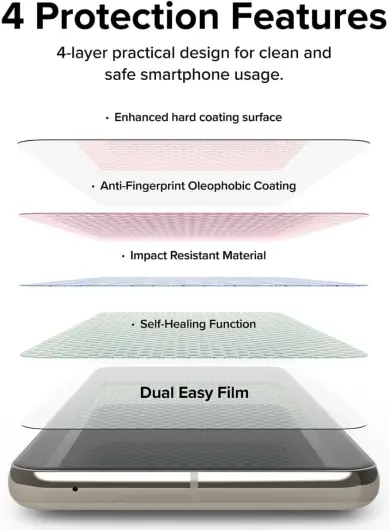 De Ringke Dual Easy Film is een transparante PET display folie met hoge resolutie en aanraakgevoeligheid. Deze screen protector heeft een ontwerp uit vier lagen die een goede bescherming biedt tegen vallen en krassen op het beeldscherm van je Google Pixel 8 Pro. De screenprotector hecht gemakkelijk en is door de meegeleverde Jig eenvoudig, snel en recht aan te brengen.