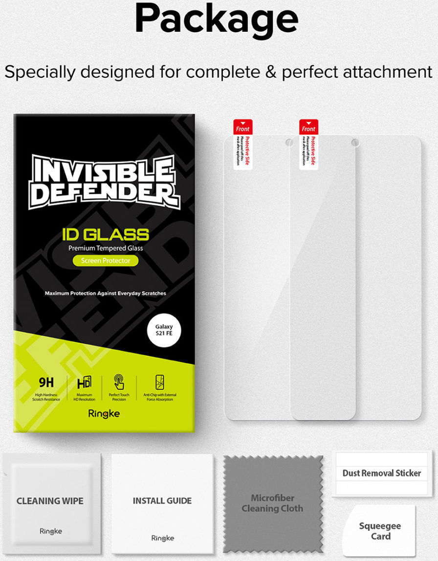 De naam ID Glass staat voor Invisible Defender Glass. Dit betekent dat je een uitstekende bescherming geniet zonder dat je het door hebt dat er een Screen Protector op je display zit bevestigd. De Tempered Glass is daarnaast speciaal ontworpen om de originele resolutie van je Samsung Galaxy S21 FE te behouden. Tot slot wordt de Ringke ID Glass Screen Protector geleverd met schoonmaaktools en een installatiegids. Op deze manier zet jij de Screen Protector op een juiste manier op het schone scherm van je Samsung Galaxy S21 FE!