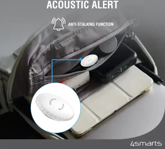 Door de goede afwerking is de SmartTag ook ongevoelig voor stof en vuil. De tracking gadget wordt geleverd met een moderne sleutelhanger zodat je hem snel en eenvoudig aan je rugzak of sleutelhanger kunt bevestigen. Wanneer je je SkyTag kwijtraakt, kan deze worden uitgelezen met elke smartphone die een NFC-chip heeft (ook Android). Als je deze smartphone dichtbij de tracker houdt, wordt informatie weergegeven die je hebt ingevoerd bij het instellen van de SkyTag. Zo kan de vinder contact met je opnemen en je informeren over de vondst. Dankzij een geïntegreerd geluidssysteem kan de 4smarts SkyTag je met een signaaltoon laten zien waar je verloren spullen zijn.